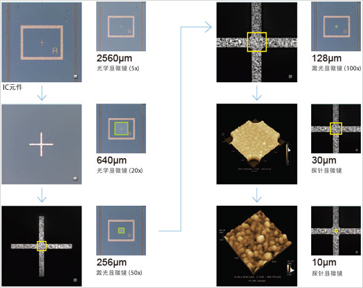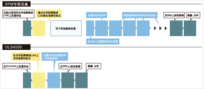 放置好樣品后,所有的操作都在1臺裝置上完成??梢匝杆?,正確的把觀察對象移到SPM顯微鏡下面,所以只要掃描1次就能獲取所需的SPM影像。