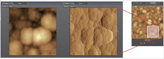 使用向?qū)Чδ埽?可以觀察時進(jìn)一步放大探針顯微鏡拍到的影像的所需部分倍率。只要在影像上用鼠標(biāo)指針設(shè)置放大范圍并掃描, 就可以獲取所需的SPM影像??梢宰杂稍O(shè)置掃描范圍, 所以大幅度提高了觀察和測量的效率。