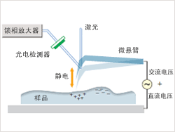 使用導(dǎo)電性微懸臂并施加交流電壓, 檢測出微懸臂與樣品表面之間作用的靜電, 從而在影像中呈現(xiàn)樣品表面的電位。也稱作KFM(Kelvin Force Microscope)。