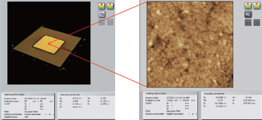 在非接觸式表面粗糙度測量中, 除了線粗糙度還可以測量面粗糙度。在面粗糙度測量中可以掌握樣品表面上指定區(qū)域內(nèi)粗糙度分布和特點(diǎn), 并能夠與3D影像對照評價。OLS4500可以根據(jù)不同樣品和使用目的, 分別使用激光顯微鏡功能或探針顯微鏡功能測量表面粗糙度。