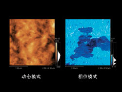 在動態(tài)模式的掃描中, 檢測出微懸臂振動的相位延遲??梢栽谟跋裰谐尸F(xiàn)樣品表面的物性差。