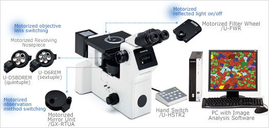 電動(dòng)物鏡轉(zhuǎn)換器可以切換物鏡,電動(dòng)云臺(tái)(鏡子單元)能切換從明視場(chǎng)觀察到熒光觀察的多種觀察方法,電動(dòng)濾鏡轉(zhuǎn)輪使照明的切換等可由近在咫尺的手控開關(guān)和電腦完成。這些特長(zhǎng)進(jìn)一步提高了操作性,便于集中觀察。可以按照需要自由組合電動(dòng)單元。